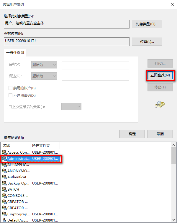 7、我们点击高级以后,选择用户或组的对话框有所变化,在这个对话框中点击:立即查找(N);在搜索结果(U)的列表中找到本机用户名并左键点击,再点击:确定;