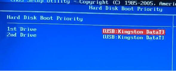 3.回到主界面选择Boot Device Configuration,选择Hard Disk Boot priority,1st Drive选择USB:U盘的名字。如图所示:
