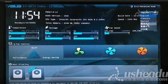 1.开机后连续的按Del键进入bios设置,界面右上角地方修改语言,然后点击右上角顶部的advanced mode进入高级模式。如图所示: