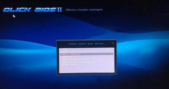 2.在启动选项窗口中,选择UEFI:SanDisk,按回车键进入,如下图所示: