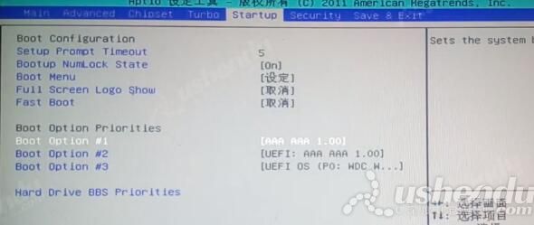3.选择Startup,选择Hard Drive BBS这项,Boot Option #1选择U盘的名字。如图所示: