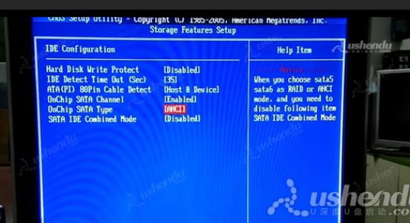 3.返回到主界面选择Integrated Peripherals,选择第一项Storage开头的, 选择OnChip SATA Device,选择OnChip SATA Type,选择AHCI。如图所示:
