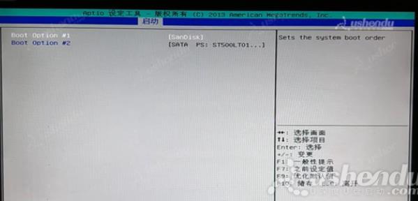 4.返回上个界面选择Boot Option #1,选择U盘的名字为第一启动项。如图所示: