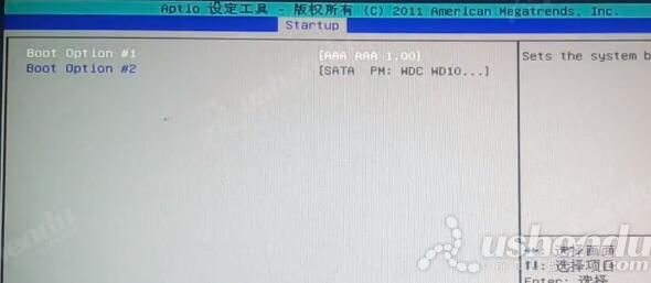 3.选择Startup,选择Hard Drive BBS这项,Boot Option #1选择U盘的名字。如图所示:
