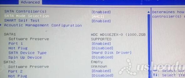 1.开机后不停的按Del键,进入bios界面。选择Advanced,选择SATA Configuration里的SATA Mode Selection,选择AHCI。如图所示: