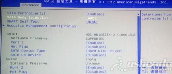 2.选择Advanced,选择SATA Configuration里的SATA Mode Selection,选择AHCI。要安装XP系统选择IDE,AHCI适合WIN7以上的系统安装。如图所示: