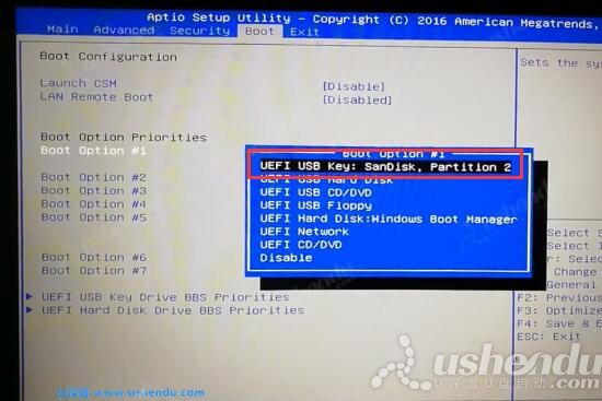 4.切换到boot,选择第一个boot option #1。回车。设置,如图所示: