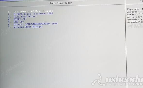 3.选择Boot,选择Boot Type Order,然后把USB Device用F5或者是F6调到第一个。如图所示: