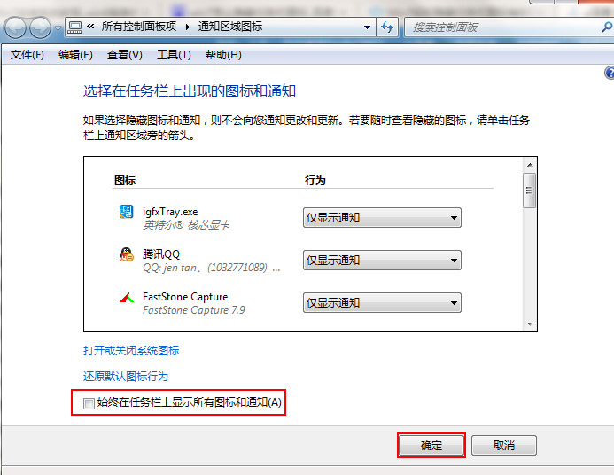 3、在这个界面下方可以看见“始终在任务栏上显示所有图标和通知”选项,将它的勾选取消,点击“确定”后完成设置,如下图所示: