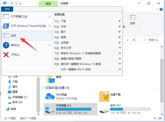 2、在展开的选项界面中,点选“选项”来进行更改文件夹和搜索选项的操作。如图所示: