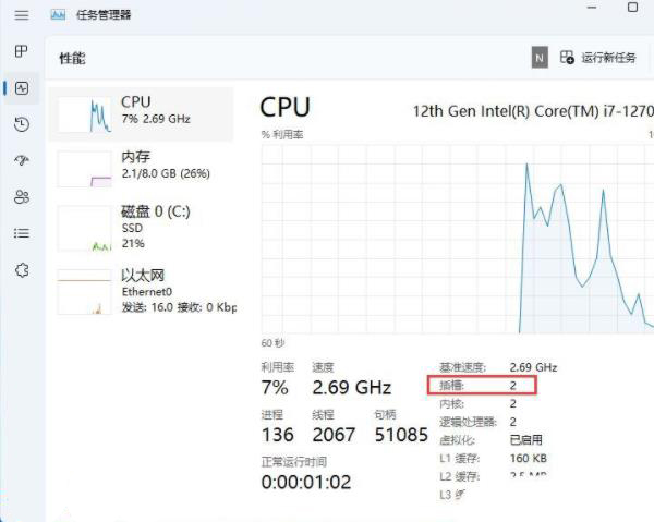 2、任务管理器窗口,右下方即可查看到当前设备内存插槽数;如图所示: