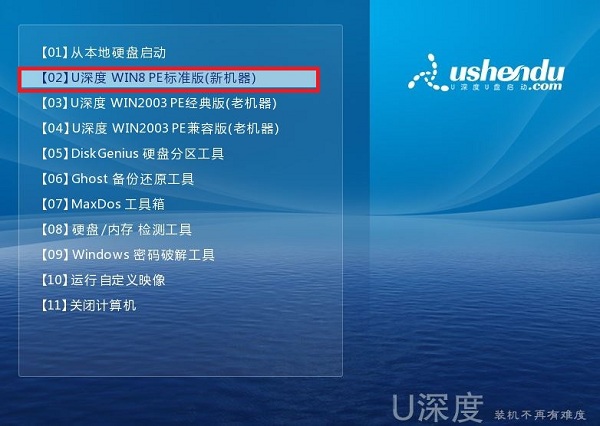 1、重启电脑等待出现开机画面按下启动快捷键,选择u盘启动进入到u深度主菜单,选取“【02】u深度win8 pe标准版(新机器)”选项,按下回车键确认,如下图所示: