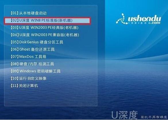 1、首先将u盘制作成u盘启动盘,接着前往相关网站下载win7系统存到u盘启动盘,重启电脑等待出现开机画面按下启动快捷键,选择u盘启动进入到u深度主菜单,选取“【02】u深度win8 pe标 准 版(新机器)”选项,按下回车键确认,如下图所示: