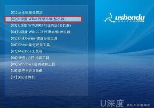 1、重启电脑等待出现开机画面按下启动快捷键,选择u盘启动进入到u深度主菜单,选取“【02】u深度win8 pe标准版(新机器)”选项,按下回车键确认,如下图所示: