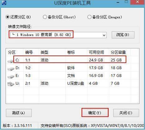 2、进入u深度pe界面后,在弹出的“u深度PE装机工具”中选择ghost win10系统安装包,接着选择系统盘,点击“确定”,如图所示: