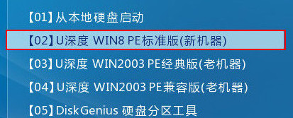 1、将制作好的u深度u盘启动盘插入电脑接口,开机按快捷键F9进入主菜单界面,选择“【02】U深度WIN8 PE标准版(新机器)”,如下图所示: