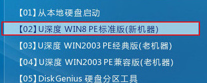 1、将u深度u盘启动盘连接至电脑,重启等待出现开机画面按下启动快捷键F12进入到启动项选择窗口,选取【02】U深度WIN8PE标准版(新机器),按下回车键执行操作,如图所示: