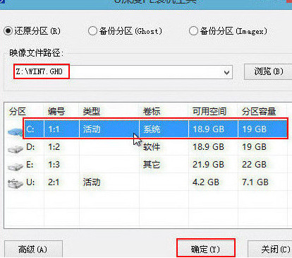 2、在弹出u深度pe装机工具中,选择win7镜像放在c盘,点击确定,如下图所示: