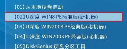1、首先将u盘制作成u深度u盘启动盘,接着前往相关网站下载win7系统存到u盘启动盘,重启电脑等待出现开机画面按下启动快捷键,选择u盘启动进入到u深度主菜单,选取“【02】U深度WIN8 PE标准版(新机器)”选项,按下回车键确认,如下图所示: