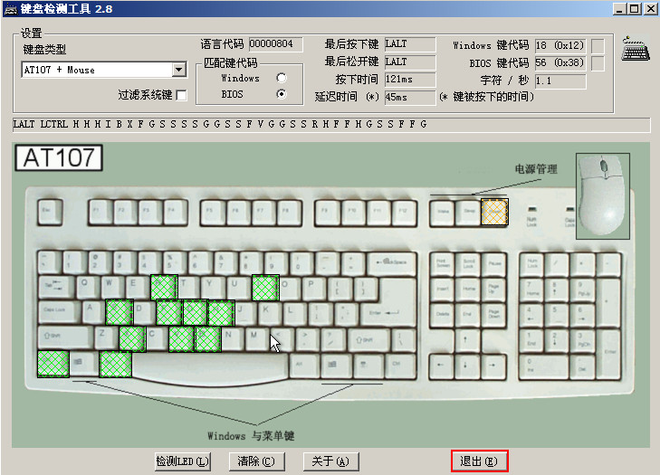 5、然后按键盘上任意键进行检测,检测过的键会在模拟键盘上显示,同时设置栏下方也会记录我们所按下的按键,如下图所示: