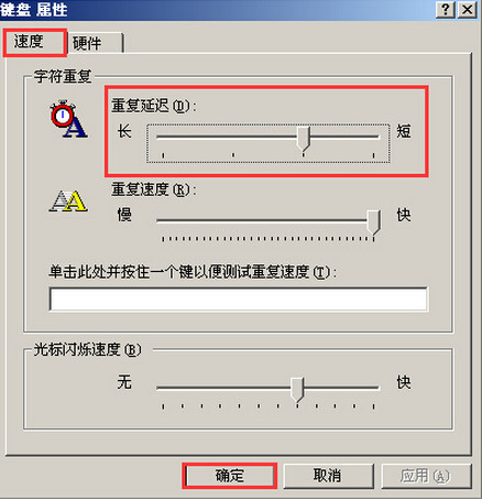 3、弹出的键盘属性界面,点击“速度”选项卡,在“重复延迟”下调整反应速度,延迟越短反应速度自然越快,设置完成点击确定,如下图所示: