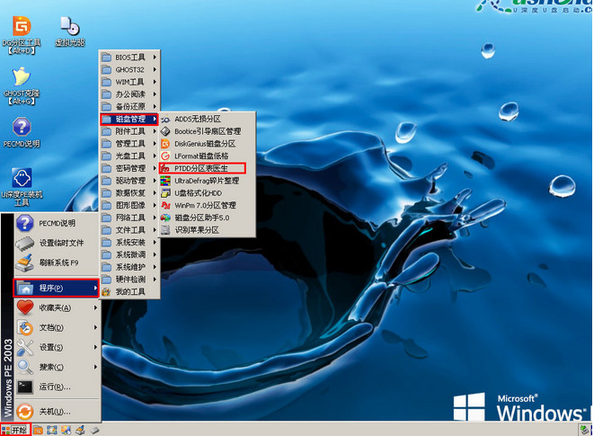 2、进入pe系统后,依次点开“开始-程序-磁盘管理-PTDD分区表医生”,如下图所示: