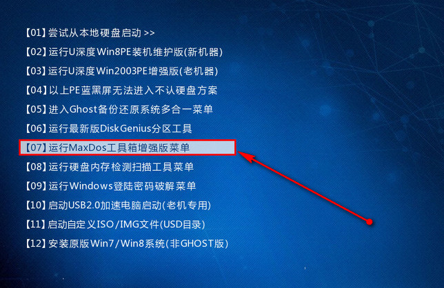 1、将制作好的u深度u盘启动盘插入电脑接口,开机按快捷键进入主菜单界面,选择“【07】运行MaxDos工具箱增强版菜单”,如下图所示:
