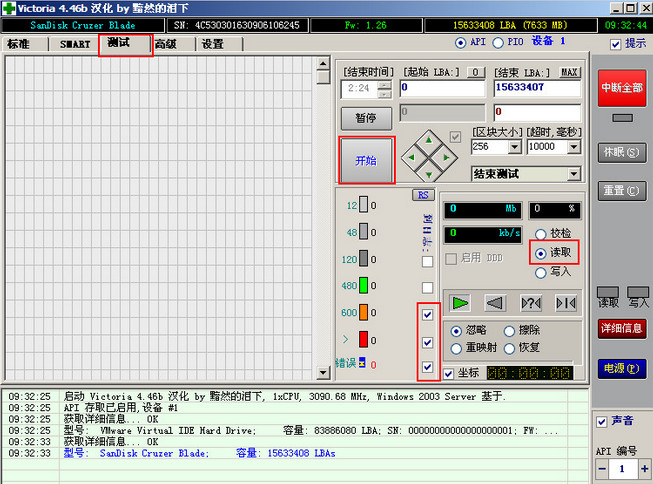 4、点击测试选项卡,然后在下方点击“读取”,接着勾选日志,最后点击“开始”即可进行检测,如下图所示: