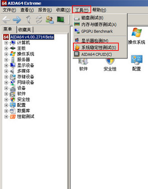 3、进入aida64界面后,打开工具栏,选择“系统稳定性测试(s)”,如下图所示: