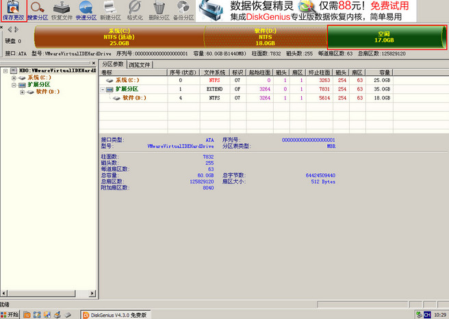 5、删除E盘分区后,我们可以看到之前E盘处变成了“空闲”状态,然后我们点击“保存更改”按钮,如下图所示: