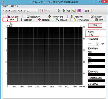 4、选择好磁盘后,点击“基准”菜单,接着再选择“读取”或“写入”进行测试(写入测试存在危险,请用户谨慎使用),然后再点击“开始”按钮开始检测,如下图所示: