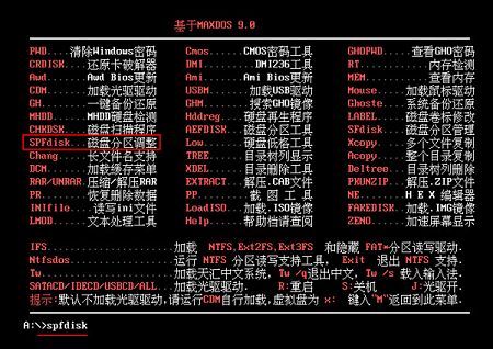 3、接着在弹出的界面中,输入spfdisk命令回车,如下图所示: