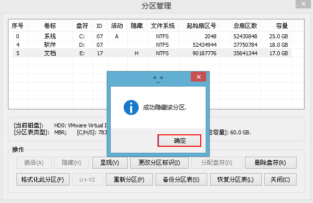 5、此时我们会看到“成功隐藏该分区”的提示,点击“确定”按钮即可,如下图所示: