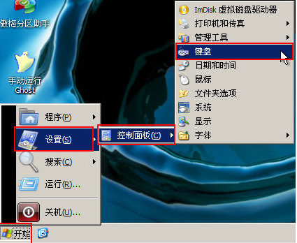 2、进入2003pe系统后,在桌面上依次点击“开始-设置-控制面板-键盘”,如下图所示: