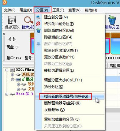 3、打开分区工具diskgenius后,点击菜单栏“分区”选项,选择“指派新的驱动器号(盘符)”选项,如下图所示:
