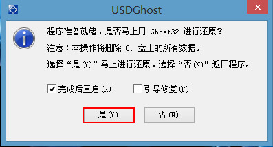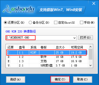 7、选择win7镜像文件后,u深度装机工具会自动读取出文件包里面的.GHO文件,随后我们选择要安装的硬盘,点击“确定”按钮进行安装,如下图所示: