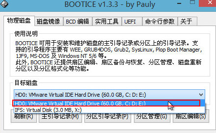 3、在弹出的bootice工具界面,首先在目标磁盘上选择自己需要进行操作的磁盘,如下图所示: