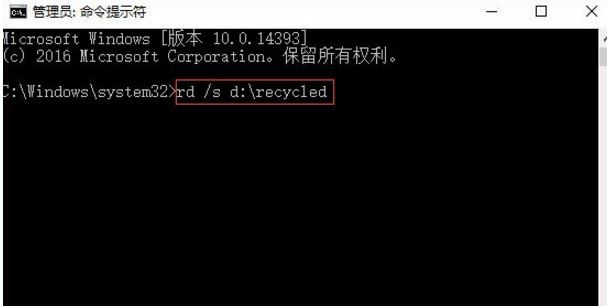 2、在命令提示符中输入: rd /s x:\recycled 按下回车键 X代表出现问题的磁盘盘符,如D盘出现问题那么这么输入:rd /s d:\recycled,如图: