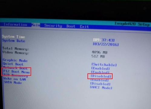 2、使用方向键控制进入“main”菜单。选中F12 boot menu,将其改为disable。