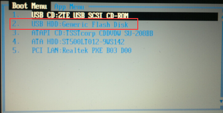 2、在启动项选择窗口,选择U盘所在的选项,按回车键进入,如图所示: